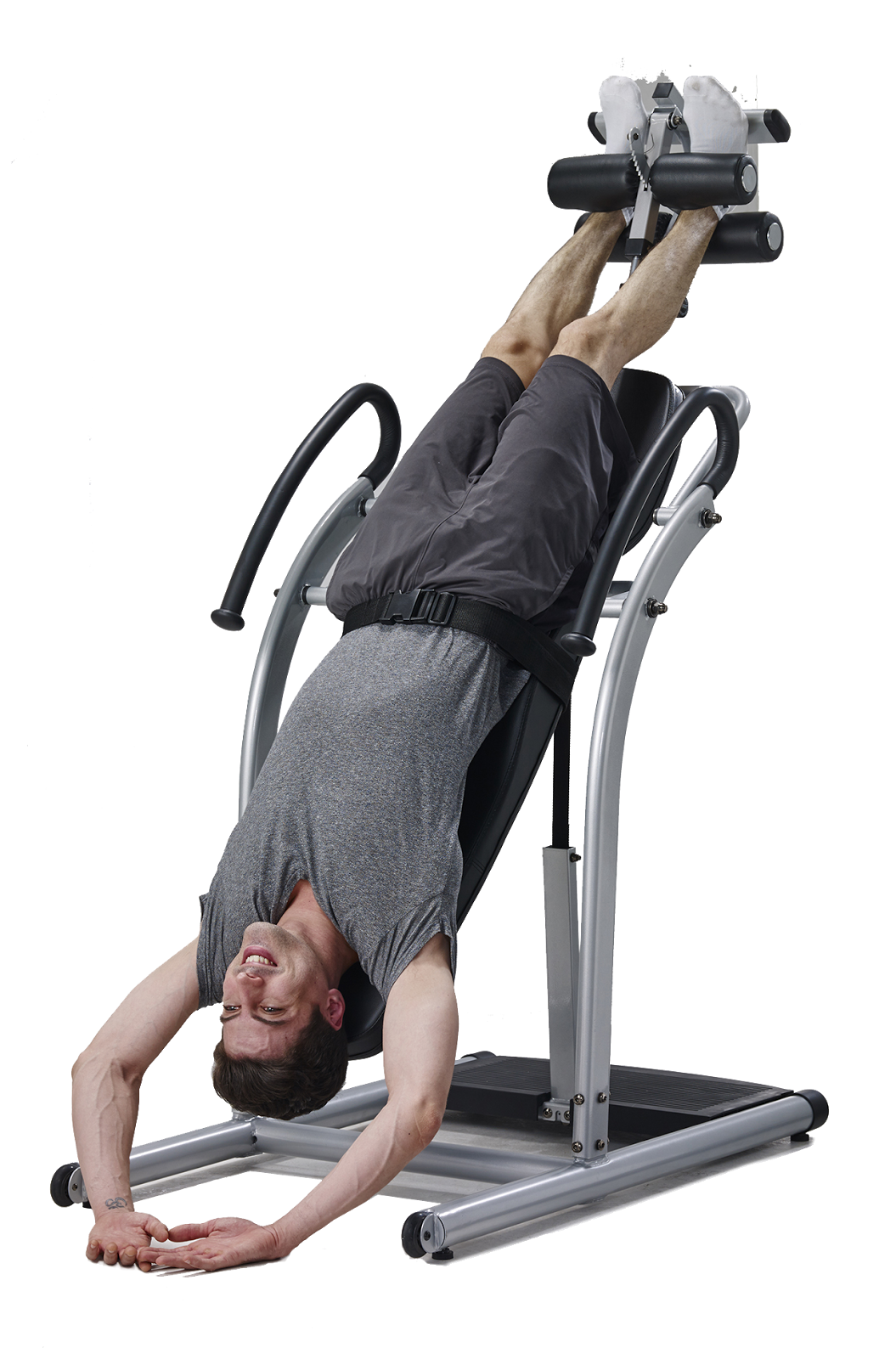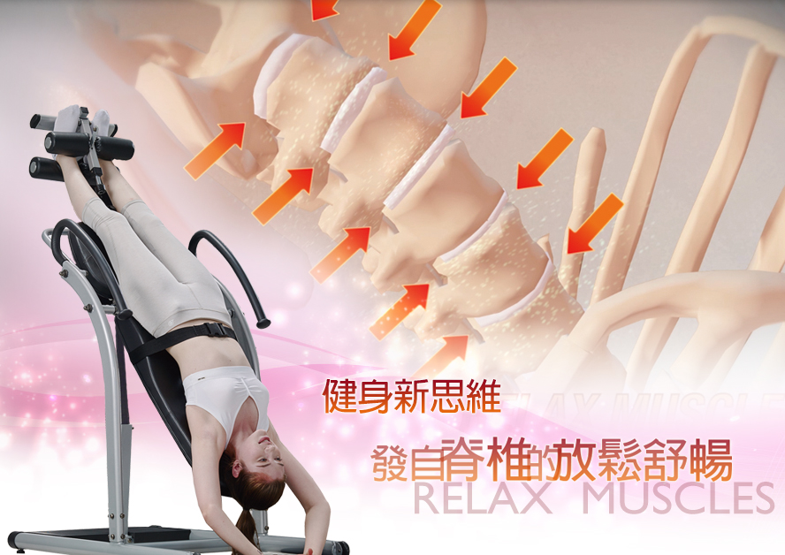 倒立椅透過腳夾(懸吊)與地心引力(體重)的雙向作用力,