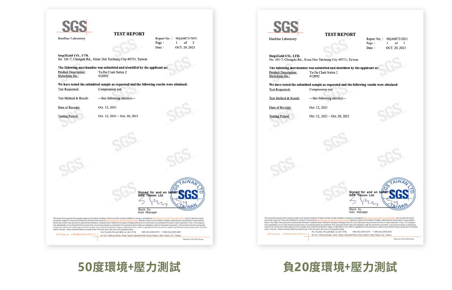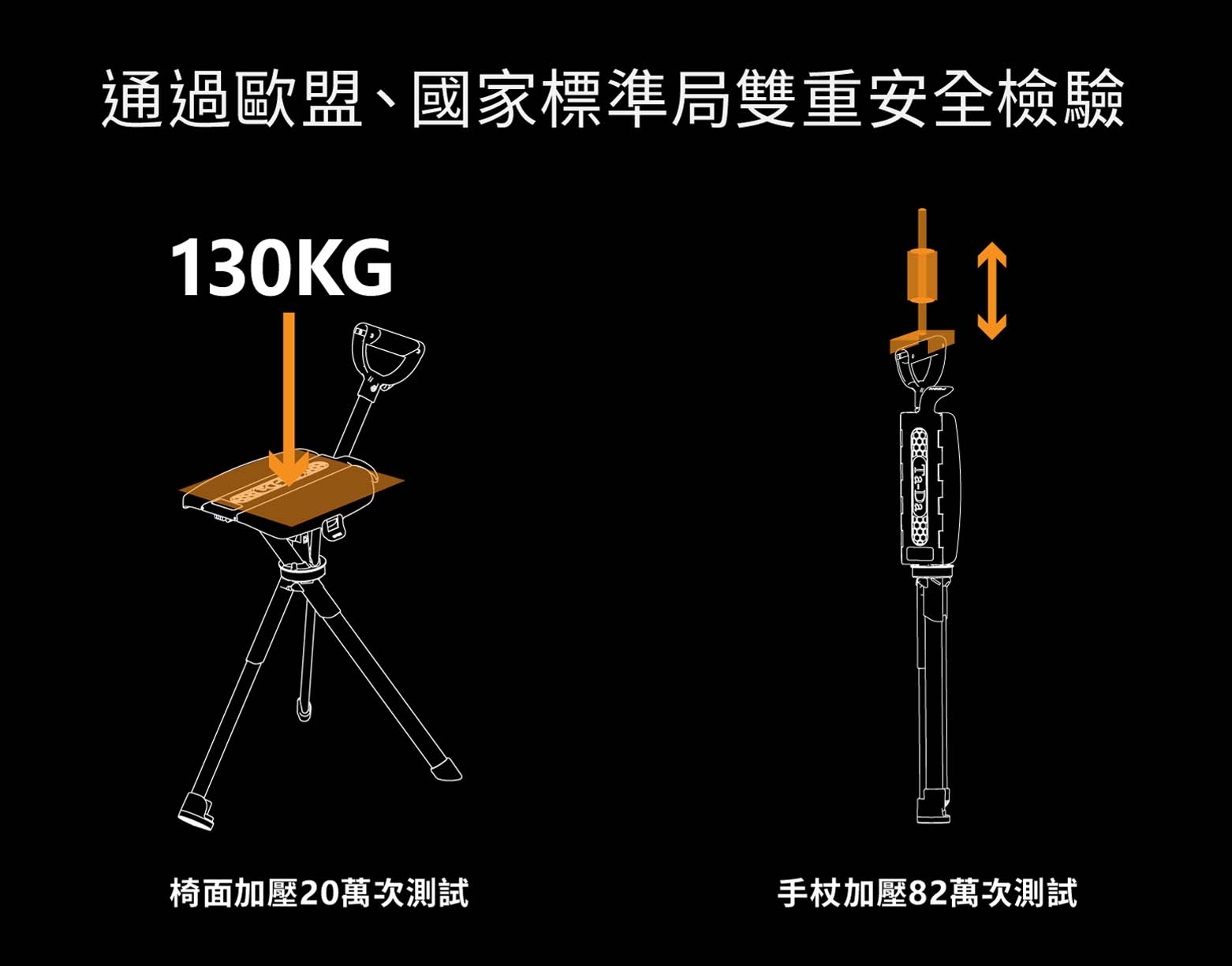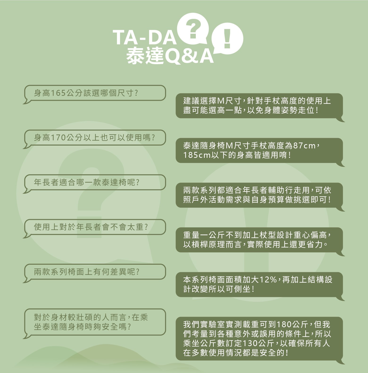 「泰達隨身椅」經過多項安全檢測,包括冷熱極端環境壓力破壞測試(攝氏50度與負20度)、20萬次椅面與82萬次手杖的加壓疲勞測試,已通過歐盟、國家標準局雙重安全檢驗。杖身採用航太等級鋁合金製成,重量不到1公斤、卻具有高達136公斤的百倍乘載力。手杖握把符合人體工學,10度角的設計和防滑紋路讓握感充實、拿起來毫不費力。尼龍強化塑料材質強韌耐衝擊且抗UV不因日曬而脆話,,彈性大椅面服貼臀型,使用者根據坐姿微調角度,下半身不易麻痺、也更舒適。